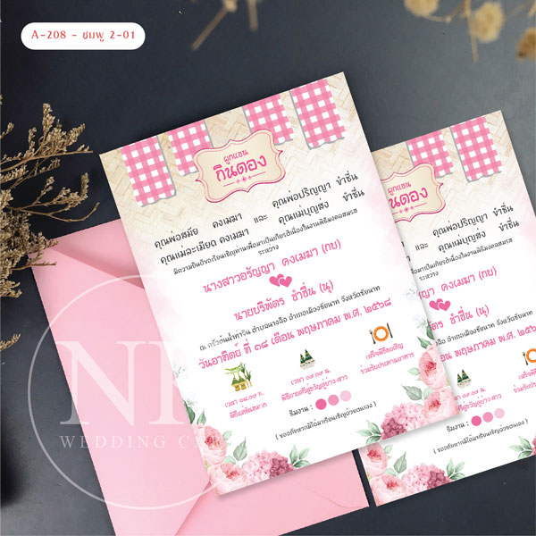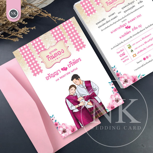 การ์ดแต่งงานมินิมอล สไตล์อีสาน กินดอง สีชมพู พร้อมซอง | รหัส A-208-2 | A-208-2