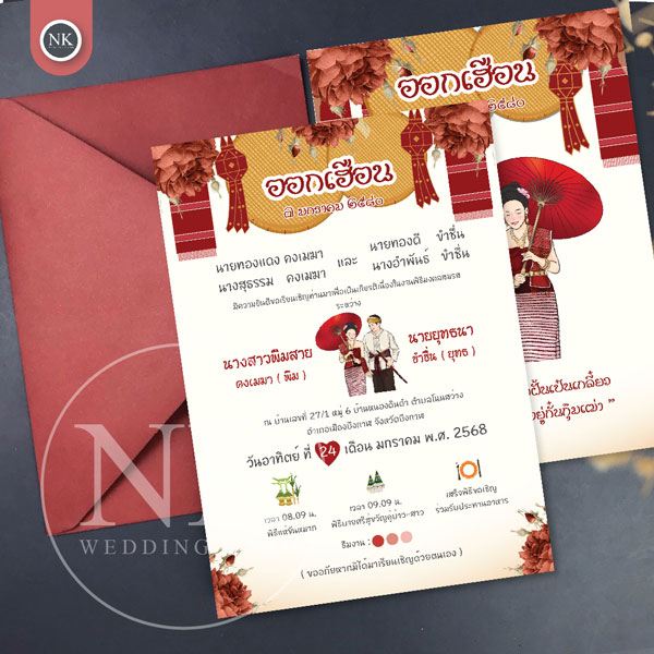 การ์ดแต่งงานออกเฮือน สีแดง พร้อมไฟล์การ์ดออนไลน์ | A - 278 การ์ดเชิญงานแต่งแบบออกเฮือน ดีไซน์สวยงาม เหมาะสำหรับคู่บ่าวสาวที่ต้องการการ์ดแต่งงานสไตล์พื้นบ้าน ตัวการ์ดเน้นความเรียบง่ายและความสุภาพ เหมาะกับงานแต่งแบบอบอุ่น