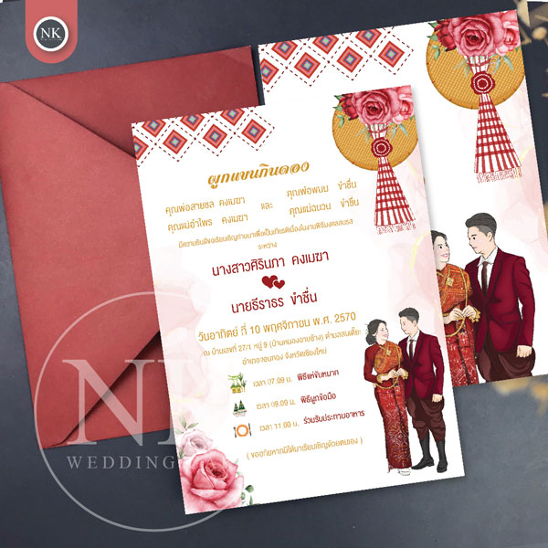การ์ดแต่งงาน สไตล์อีสานกินดอง สีแดง พร้อมซอง ไม่มีค่าออกแบบ | รหัส A-083V2 การ์ดกินดองดีไซน์สวยงาม โทนสีสุภาพ เหมาะสำหรับงานแต่งงานแบบไทยหรือพิธีมงคล ตัวการ์ดออกแบบให้ดูเรียบง่ายแต่มีความหรูหรา ช่วยสร้างความประทับใจให้กับแขกที่ได้รับการ์ดเชิญตั้งแต่แรกเห็น