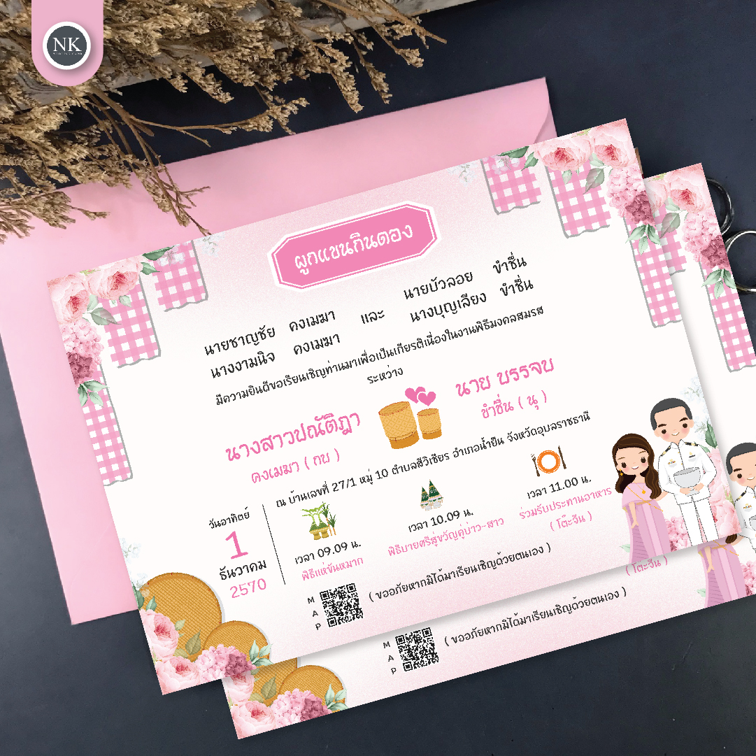 การ์ดแต่งงานสไตล์อีสาน “กินดอง” มาในดีไซน์มินิมอล เรียบง่าย แต่มีเอกลักษณ์ เหมาะสำหรับคู่บ่าวสาวที่อยากได้การ์ดแต่งงานโดดเด่นในธีมลูกทุ่งอีสาน โดยยังคงความทันสมัยและสดใส อ่อนหวาน เข้ากับงานแต่งทุกสไตล์