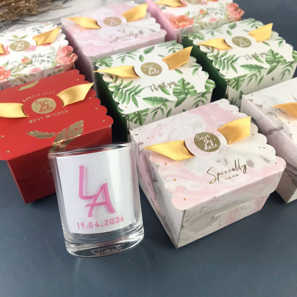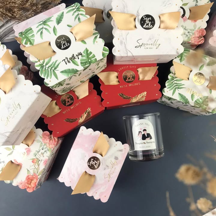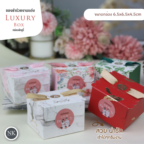 ตัวกล่องออกแบบทรงสี่เหลี่ยมขนาดกำลังดี มาพร้อมโบว์ตกแต่งด้านบน เพิ่มความหรูหราและดูน่ารักในสไตล์มินิมอล สามารถใช้ใส่ของชำร่วยได้หลากหลาย เช่น ขนม ของที่ระลึก เทียนหอม หรือของขวัญเล็ก ๆ สำหรับแขกในงาน