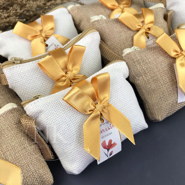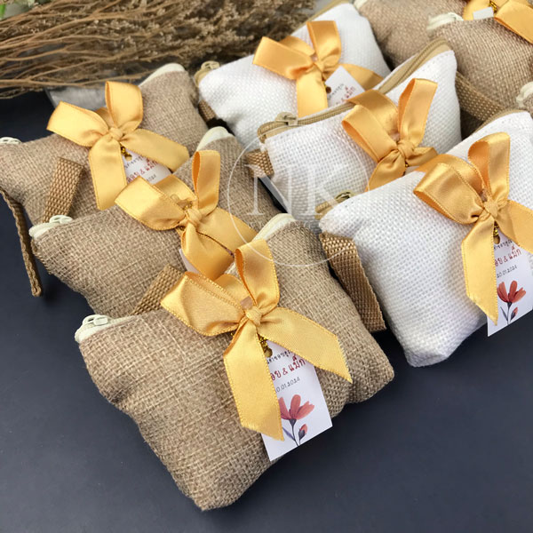 ของชำร่วยงานแต่งรูปแบบกระเป๋าผ้าซิป ดีไซน์ผ้ากระสอบผสมผ้าลินิน ตกแต่งด้วยโบว์สีทอง ให้ความรู้สึกเรียบหรูและดูมีคุณค่า เหมาะสำหรับมอบให้แขกในงานแต่งงาน หรือใช้เป็นของที่ระลึกในโอกาสพิเศษ