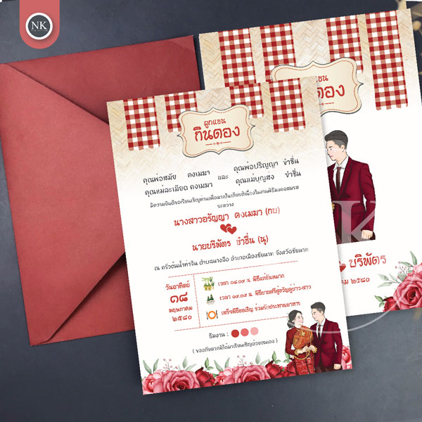 การ์ดแต่งงาน สไตล์ผูกแขนกินดอง สีแดง งานแต่งแบบอีสาน | รหัส A-208 - Red การ์ดกินดองสำหรับใช้ในงานแต่งงานหรือพิธีมงคลต่าง ๆ ดีไซน์สวยงาม เหมาะสำหรับคู่บ่าวสาวที่ต้องการการ์ดเชิญงานแต่งที่ดูเรียบร้อยและสุภาพ สามารถพิมพ์ข้อความเชิญแขก วันเวลา และสถานที่จัดงานได้อย่างชัดเจน