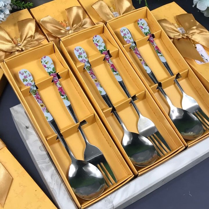 ส้อม ช้อน ส้อม ของ ชำร่วย ยาว 18.5 ซม. กล่องสีทอง ฟรีป้ายชื่อ ฟรีโบว์