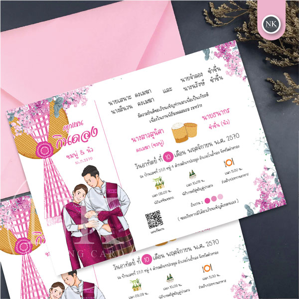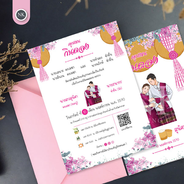 การ์ดกินดองสีชมพู การ์ดเชิญงานกินดองดีไซน์สวยงาม เหมาะสำหรับงานแต่งงานสไตล์เรียบหรู ตัวการ์ดเน้นความเรียบง่ายและความสุภาพ ช่วยให้การ์ดเชิญงานแต่งของคุณดูน่าประทับใจมากยิ่งขึ้น