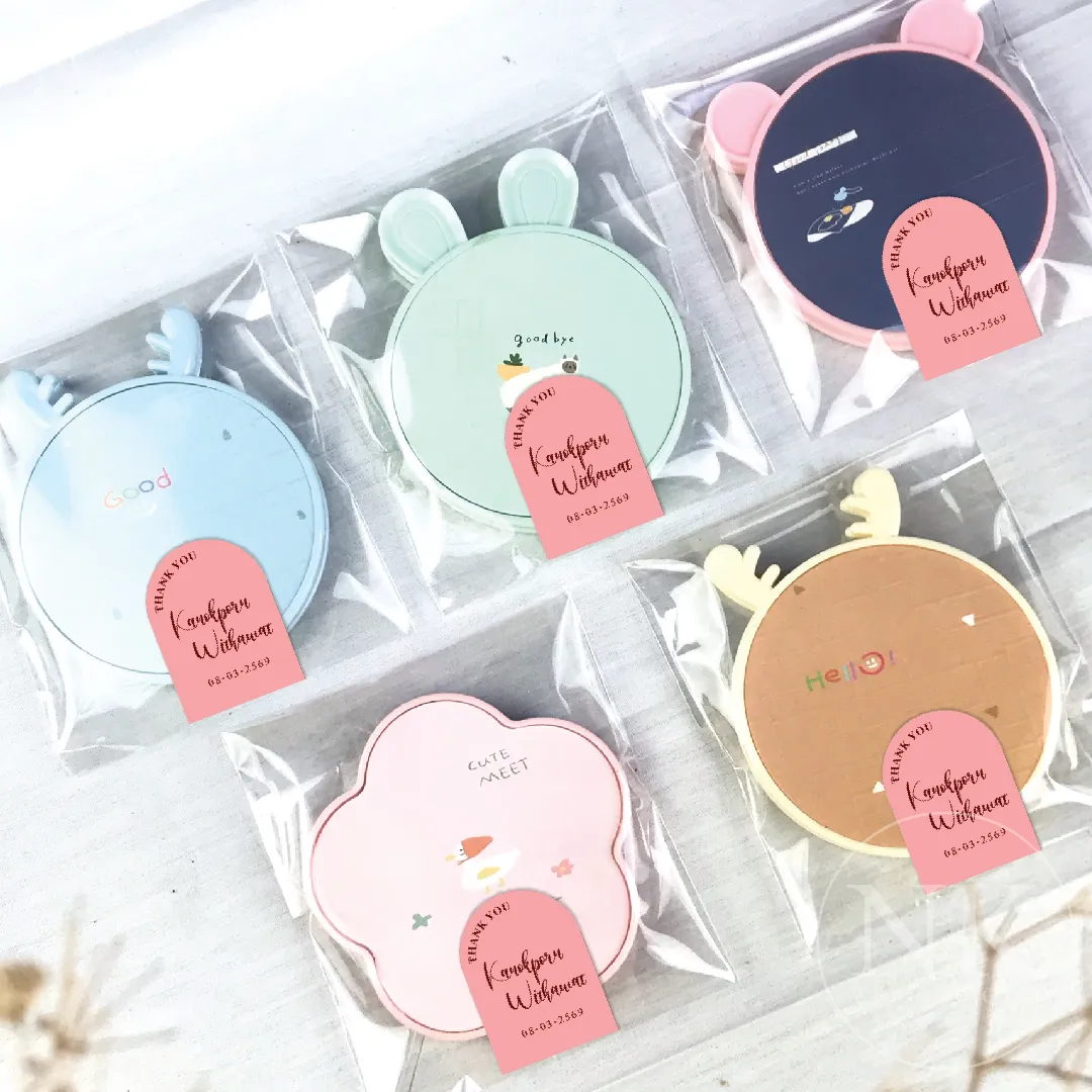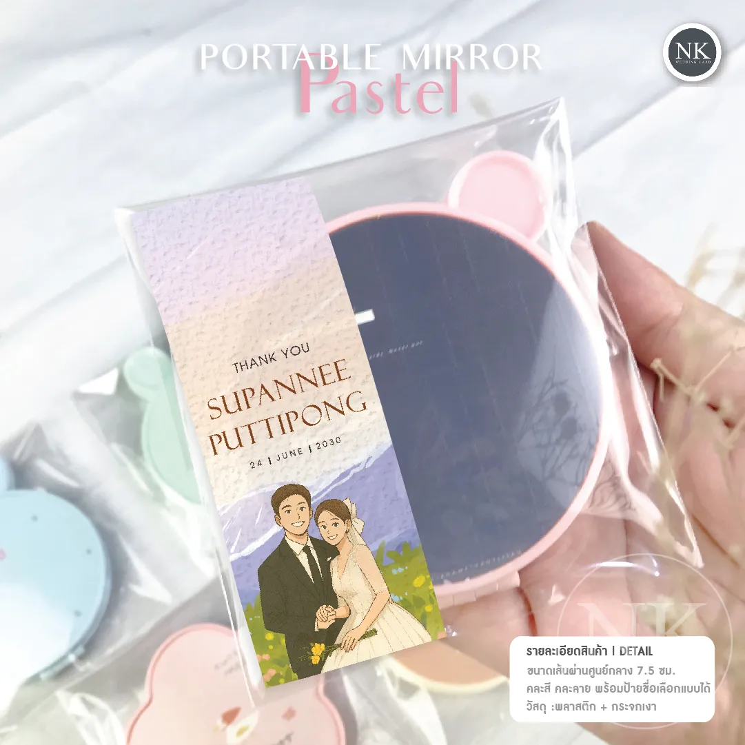 ของชำร่วยงานแต่ง “กระจกพกพา 2 ด้าน” ดีไซน์น่ารัก โทนพาสเทล พร้อมลายสัตว์สุดคิวท์ เหมาะสำหรับใช้เป็นของชำร่วยในงานแต่งงานที่ต้องการความสดใส อบอุ่น และเป็นกันเอง