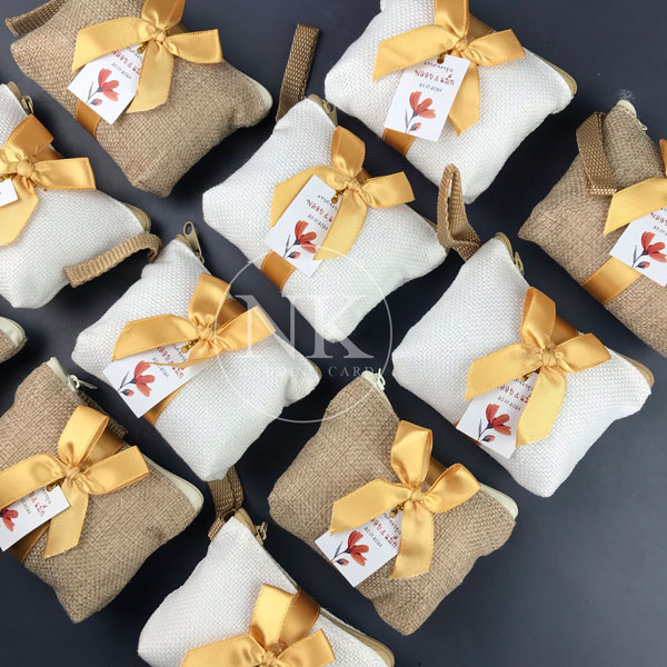 ของชำร่วยงานแต่งรูปแบบกระเป๋าผ้าซิป ดีไซน์ผ้ากระสอบผสมผ้าลินิน ตกแต่งด้วยโบว์สีทอง ให้ความรู้สึกเรียบหรูและดูมีคุณค่า เหมาะสำหรับมอบให้แขกในงานแต่งงาน หรือใช้เป็นของที่ระลึกในโอกาสพิเศษ