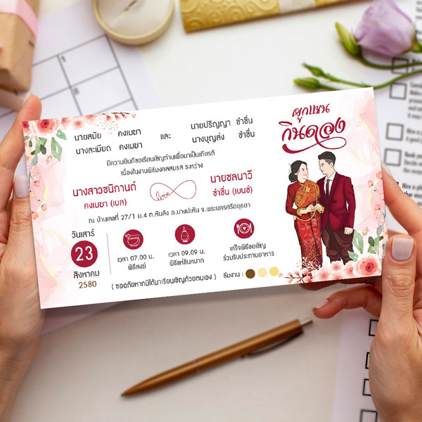 การ์ดกินดองดีไซน์เรียบหรู สไตล์อีสาน สีแดง พร้อมซอง ขนาด 4X7.5 นิ้ว เหมาะสำหรับใช้เป็นการ์ดเชิญงานแต่งงานหรือพิธีมงคลต่าง ๆ ตัวการ์ดออกแบบอย่างพิถีพิถัน เน้นความเรียบง่ายแต่ดูสุภาพ สามารถพิมพ์รายละเอียดวัน เวลา และสถานที่จัดงานได้อย่างชัดเจน เหมาะสำหรับคู่บ่าวสาวที่ต้องการการ์ดแต่งงานสวย ๆ ที่ดูอบอุ่นและเป็นกันเอง